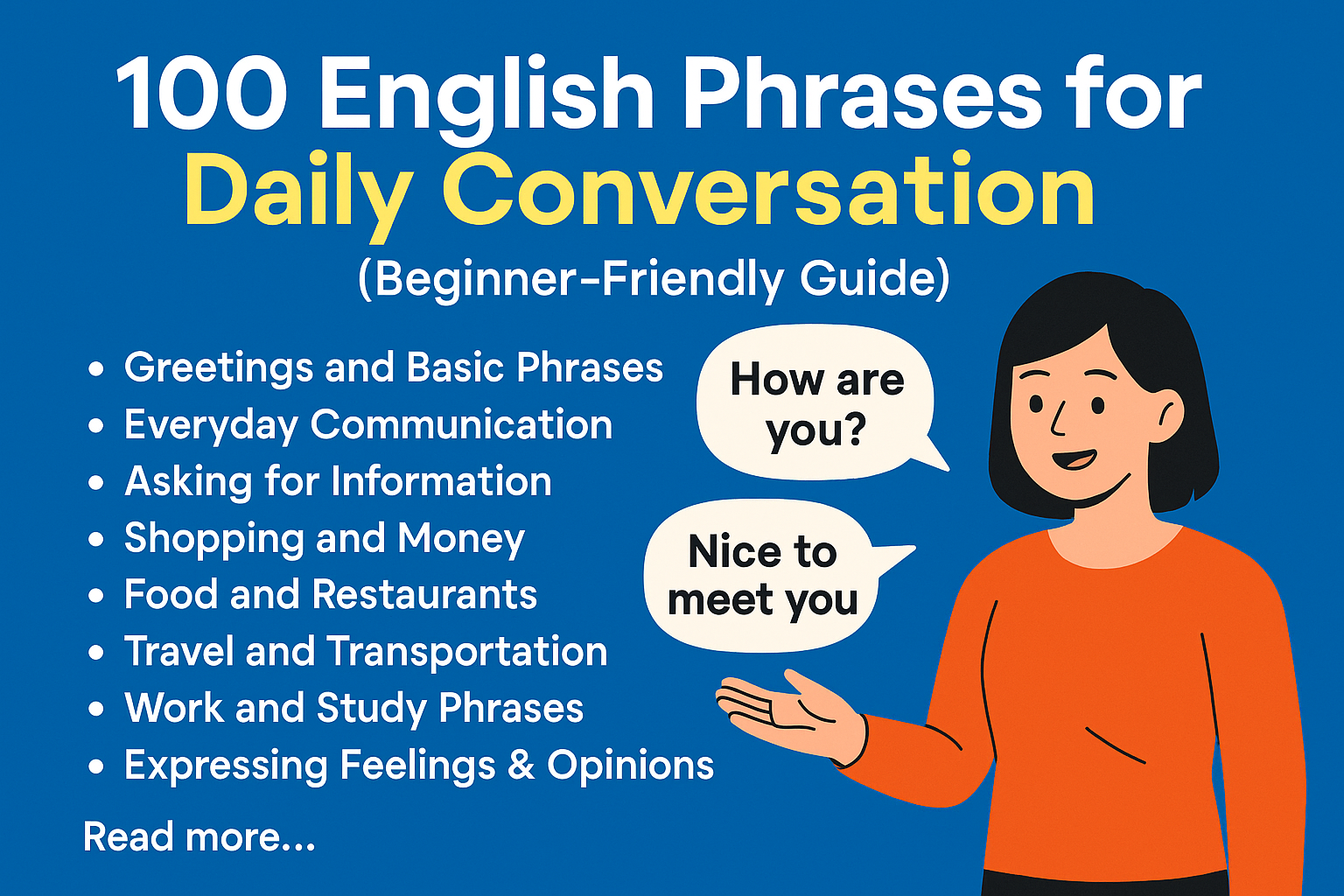 Learn 100 essential English phrases for daily conversation. Perfect for A1–A2 learners who want to speak confidently in real-life situations with clear examples.